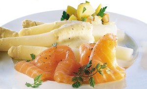 Verdeel de uitgelekte asperges op een schaal of bord. Daar bovenop legt u de zalm en tot slot schenkt u de saus er over.